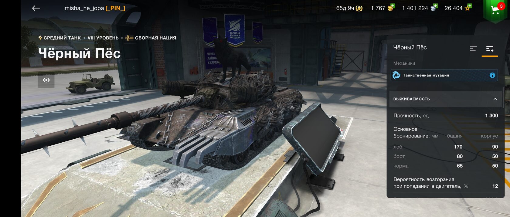его можно было получить только в событии в октябре 2023 года, у него есть уникальная механика "Таинственная мутация", которая улучшает разные характеристики танка на разных типах карт, у танка отличный урон с выстрела в 400 единиц, уникальная внешность, с черным псом на башне танка делает этот танк уникальным